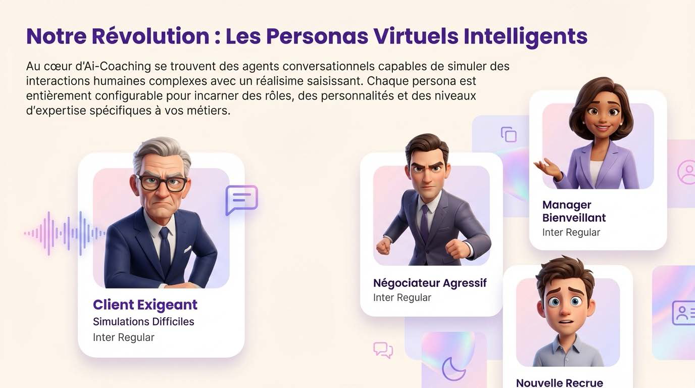 AiCoaching révolutionne l’apprentissage professionnel en vous permettant de créer, personnaliser et scénariser des formations immersives basées sur des mises en situation réalistes et interactives.