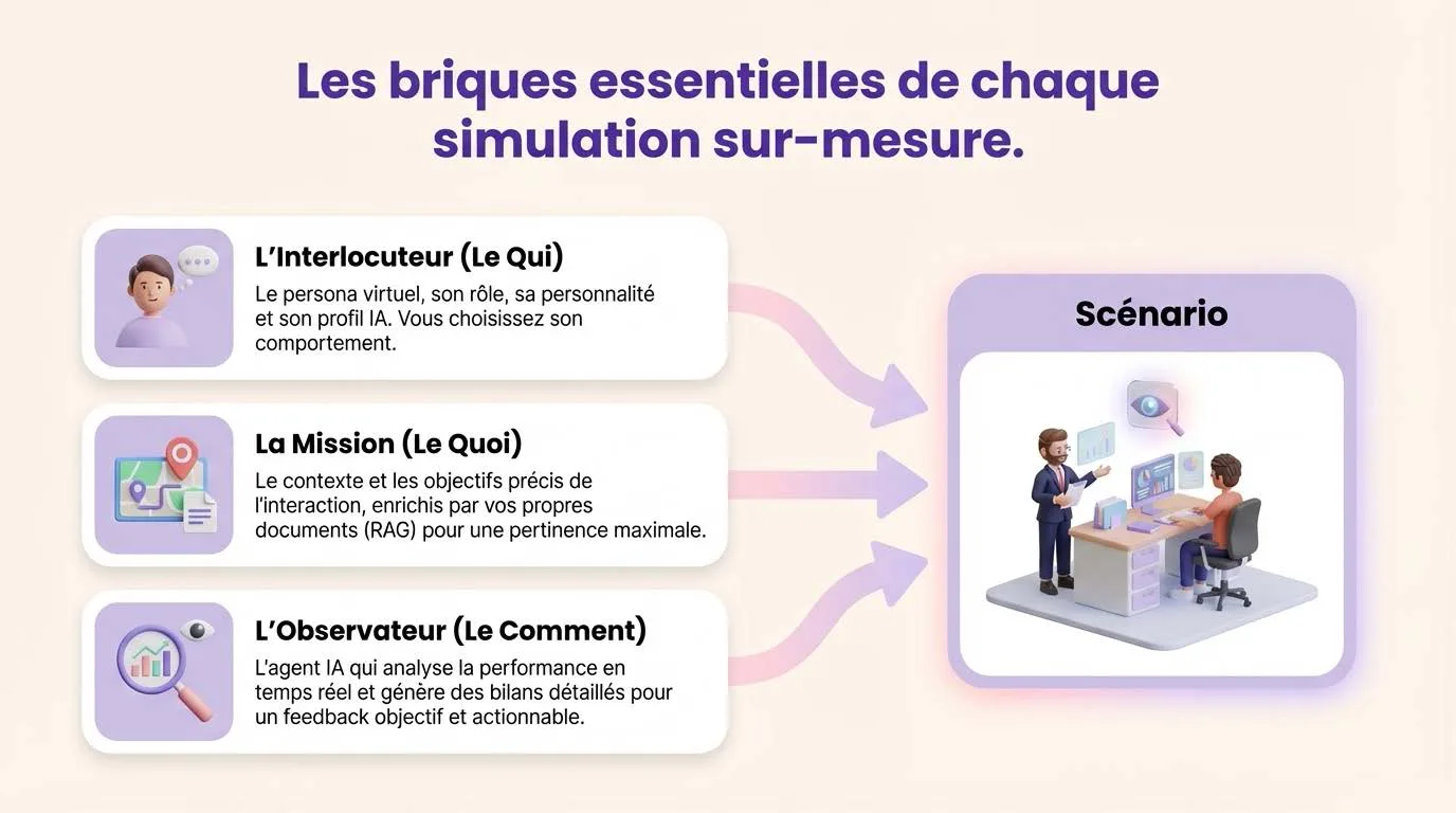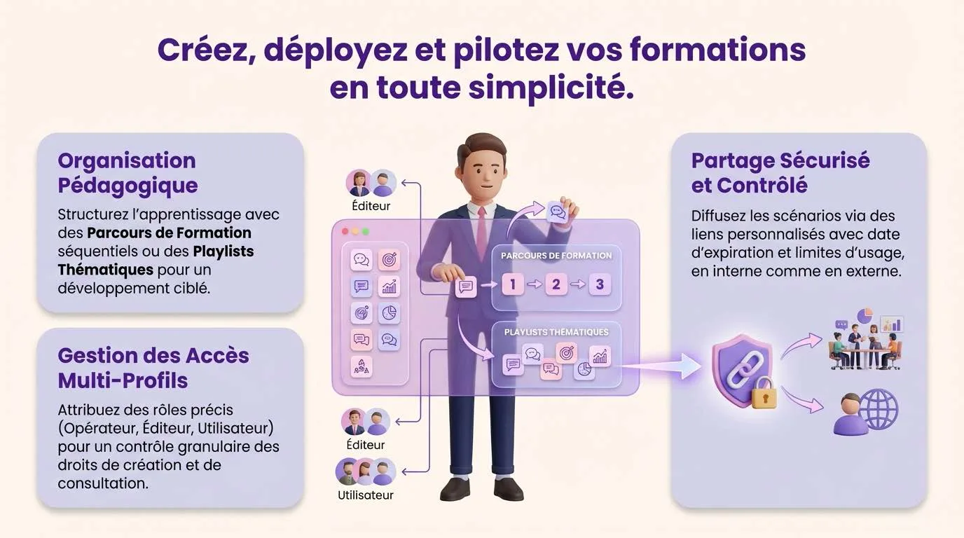 Créez, partagez et animez vos propres scénarios de formation IA avec une solution agile et puissante.