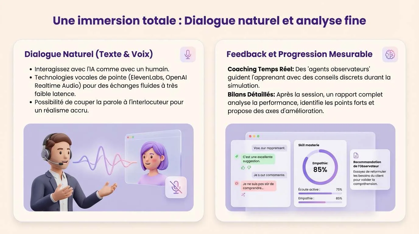 Des simulations IA réalistes en texte ou voix pour s’entraîner comme dans le réel.