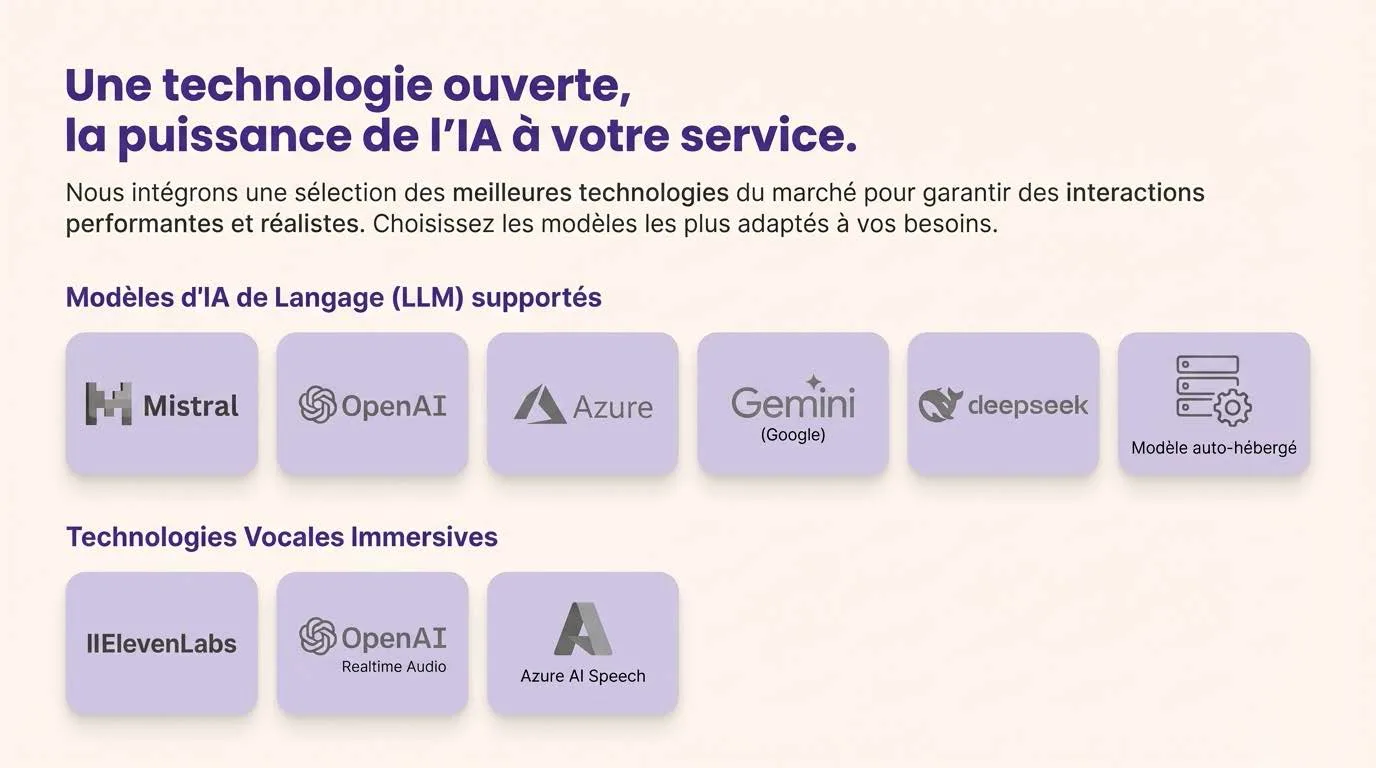 Choisissez les technologies d’IA les plus adaptées à vos formations (OpenAI, Mistral, Gemini, AWS, etc.) pour des simulations sur‑mesure.