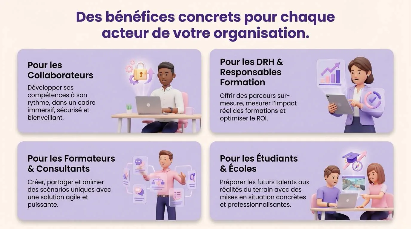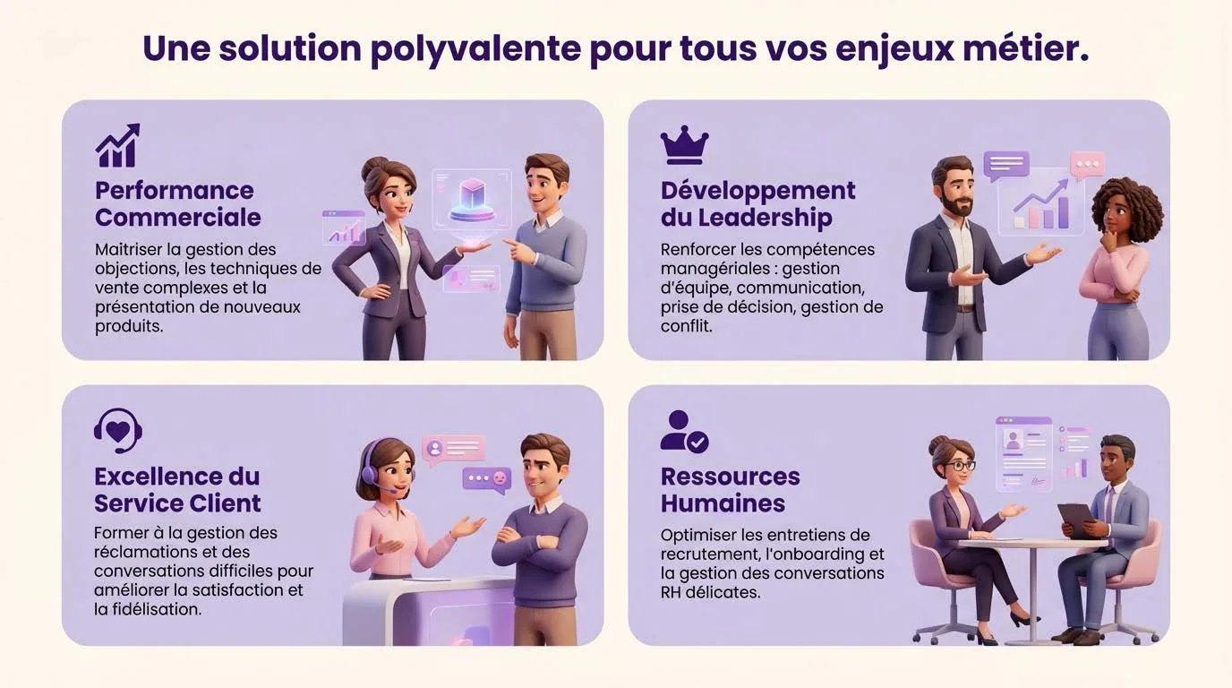 Formez efficacement dans tous les secteurs – du commerce à la santé – grâce à des scénarios IA réalistes et adaptés aux enjeux du terrain.